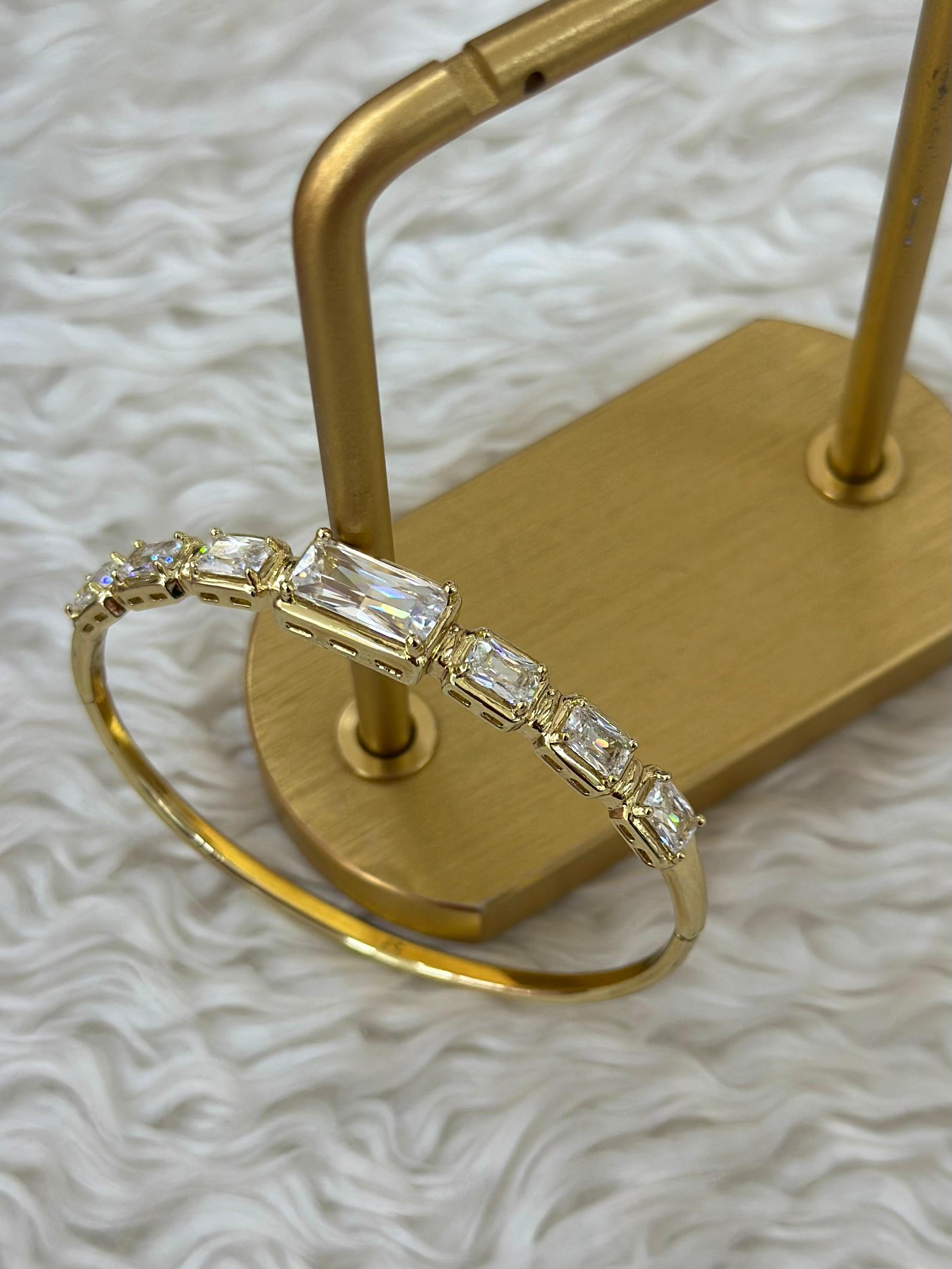Modern şıklığın simgesi olan bu baget taşlı gold kelepçe bilezik, zarafetiyle öne çıkıyor. Ortasında büyük baget taş ve iki yanında simetrik yerleştirilmiş küçük baget taşlar, bileğe göz alıcı bir ışıltı kazandırır. Altın kaplama yapısı ile hem klasik hem modern kombinlere uyum sağlar. Tak-çıkar kolay mekanizması sayesinde kullanım rahatlığı sunar. Gündüzden geceye her ortamda dikkat çekmek isteyen kadınlar için ideal bir tercihtir.